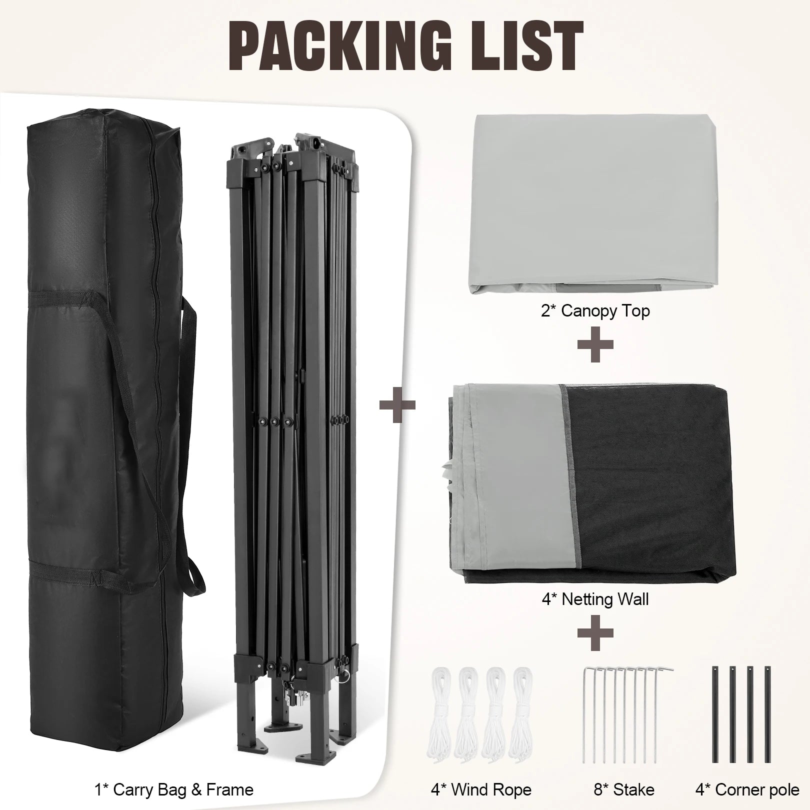 【Packing List】: 12x12 gazebo tent have a Storage Bag size is 49.2 x 8.46 x 10.43in (125x21.5x26.5cm), 2 x Canopy top, 4 x Zipper Mesh tent, 8 x Stakes, 4 x Ropes, 4 x Sandbags, 1 x Adjustable metal frame, 1 x 450D Oxford storage bag. Complete range of accessories and delivered to your home in a single parcel.
