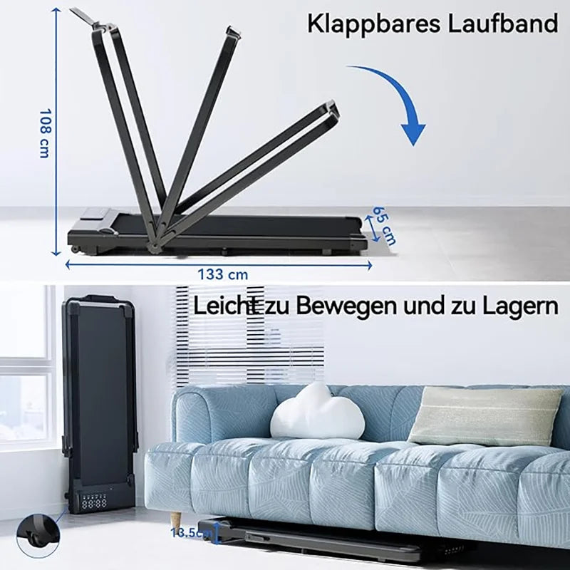 【Upgrade 3 in 1 Foldable Treadmill】The speed range of the under desk treadmill is 0.6-7.5mph. When the riser is folded, it can be used as a walking pad treadmill under desk at a speed of 0.6-3.8mph. When the handrail is raised, it can be used as the running speed is 0.6-7.5mph. You can use the remote control to change the speed or stop the walking pad.